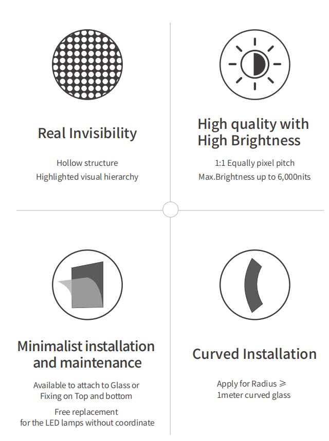 தனிப்பயனாக்கப்பட்ட டை-காஸ்ட் அலுமினிய வடிவமைப்பாக, வெளிப்படையான எல்.ஈ.டி காட்சித் திரை ஒளி, மெல்லிய மற்றும் அதன் மிக முக்கியமான அம்சங்களாக நிறுவ விரைவாக உள்ளது, இது ஷாப்பிங் மால் கண்ணாடி நிறுவல் பயன்பாடுகளுக்கு ஏற்றது. வெளிப்படையான எல்.ஈ.டி காட்சித் திரை ஒரு ஒத்திசைவான கட்டுப்பாட்டு அமைப்பால் செயலாக்கப்படுகிறது, மேலும் டி.வி.ஐ, விஜிஏ, எச்.டி.எம்.ஐ, எஸ்-வீடியோ, கலப்பு, YUV போன்ற பல்வேறு வீடியோ உள்ளீட்டு சமிக்ஞைகளை ஏற்கலாம். அனைத்து வகையான தகவல்களையும் ஒளிபரப்பலாம். யதார்த்தமான வண்ணங்கள் மற்றும் வலுவான தகவமைப்பு. எங்கள் வெளிப்படையான எல்.ஈ.டி காட்சி திரையில் பின்வரும் நன்மைகள் உள்ளன: