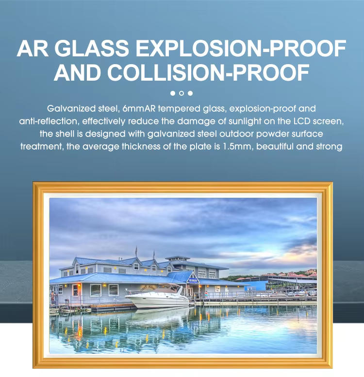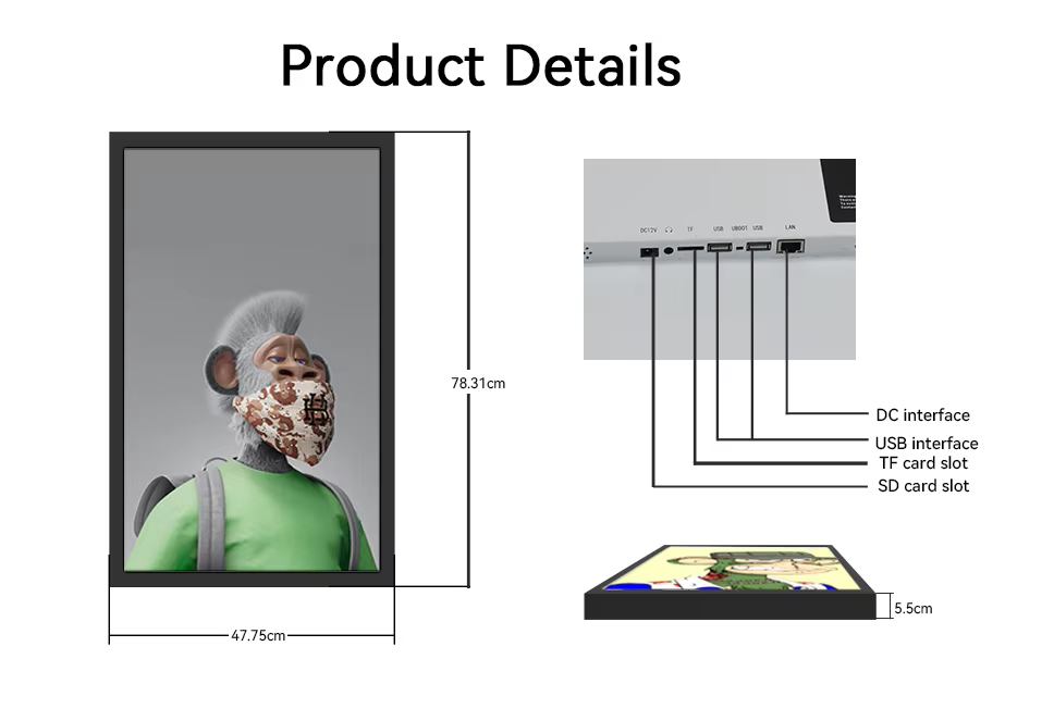 3. எளிமையான வடிவமைப்பு: எல்.சி.டி திரை சேதமடையாதபடி, மென்மையான கண்ணாடி பாதுகாப்புடன் அல்ட்ரா-மெல்லிய எல்சிடி விளம்பர இயந்திர ஷெல்,